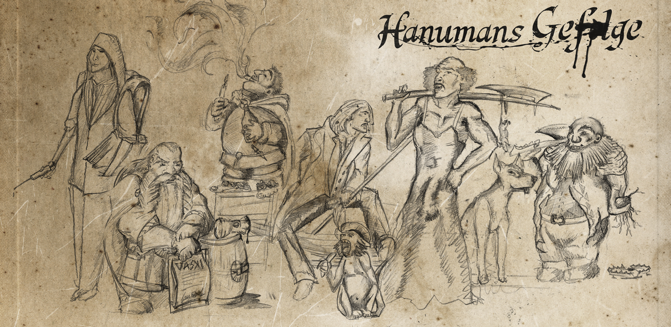 | Von links: Oberon, Vorcher Onkson, Karl Thalwirth. J'Zatkiel der Irrgeher, Hanuman, Walter Ferge, Wilson, Imrak |